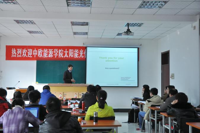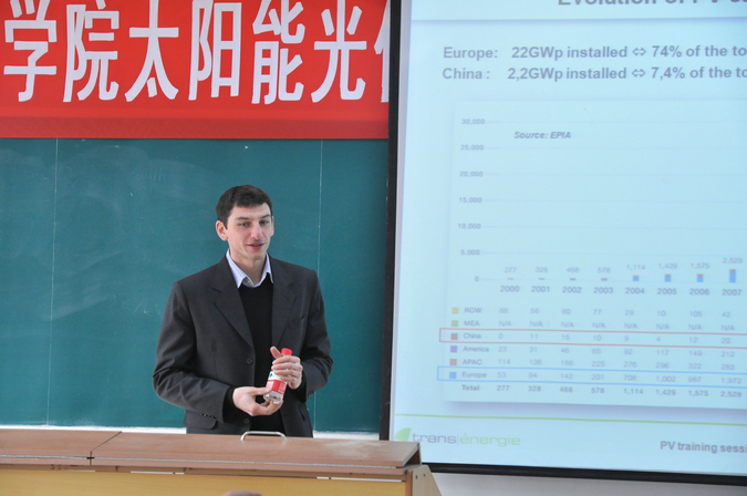1月15-17日,yl23455永利第一期太阳能光伏技术高级培训班在西五楼305-307教室举行,法国TRANSENERGIE新能源培训中心的资深培训师Damien Puigserver先生为来自上海航天汽车机电股份有限公司、中国航天科技集团公司、湖北省电力勘测设计院、广东省粤电集团、上海太阳能科技有限公司、上海新舟新能源发展公司、武汉凹伟能源科技有限公司、湖北弘元光伏科技有限公司和上海皇虹新能源技术有限公司等单位的学员们带来了三天紧凑而生动的课程。