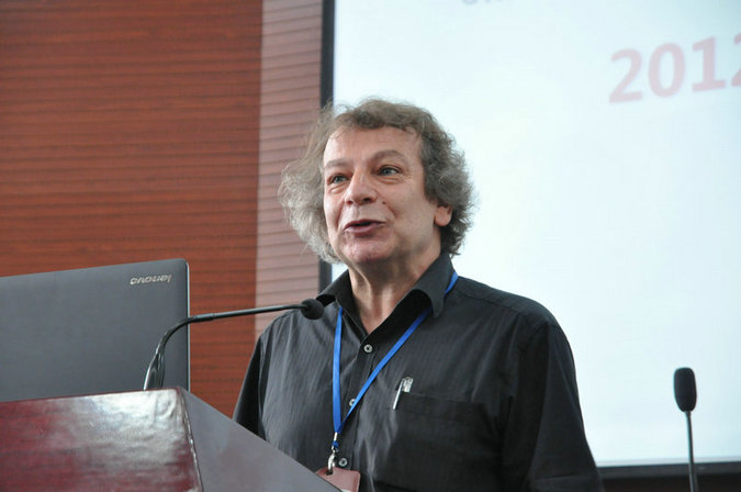 图为:欧方经理范霖教授英文致辞欢迎2012级新生