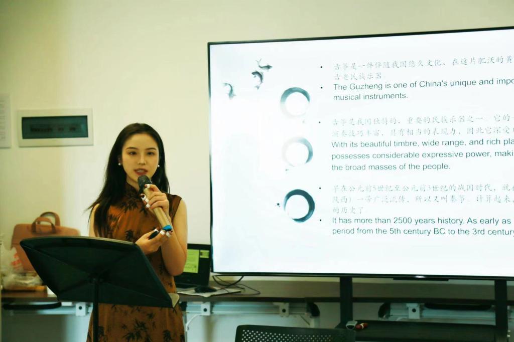 活动伊始,主持人郑晶为大家介绍了中国民族乐器的代表之一,古筝。其音色纯净、优美,能够表达出丰富的情感,是中国音乐文化中的瑰宝,也承载着中国文人的精神追求和审美情趣。