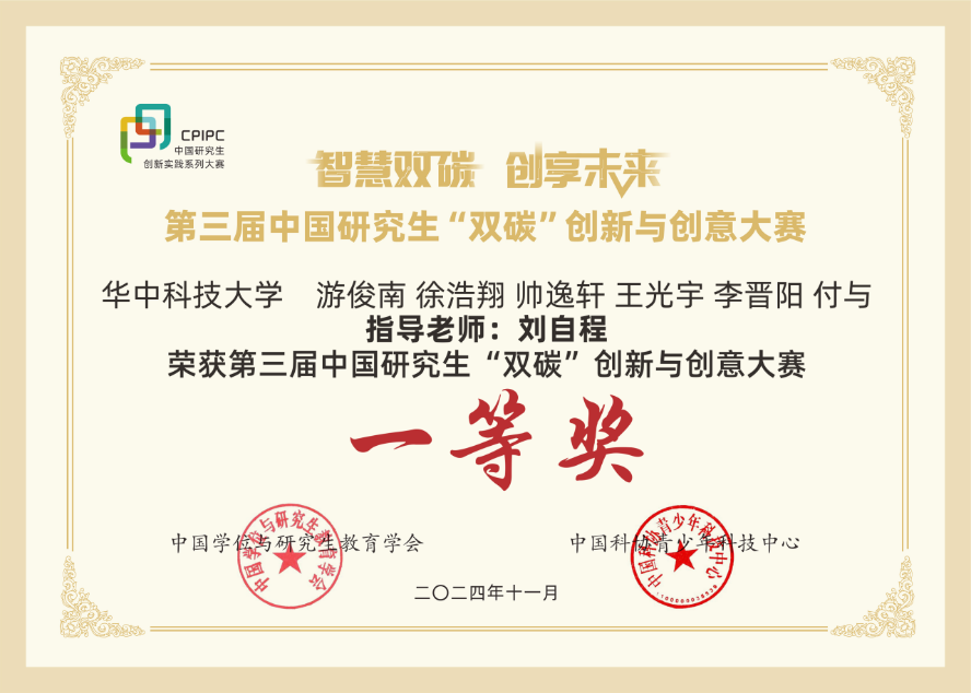2024年11月23日,由教育部学位管理与研究生教育司指导,中国学位与研究生教育学会、中国科协青少年科技中心主办的第三届中国研究生“双碳”创新与创意大赛决赛在武汉理工大学举行。本次大赛中,来自全国高校的2636件作品参赛,参赛人数达到13180人,最终267支队伍晋级决赛。经过评委们的严格评审,最终评出一等奖53名、二等奖154名、三等奖334名。公司5位学子分别参与竞赛喜获一金一银两铜的好成绩。