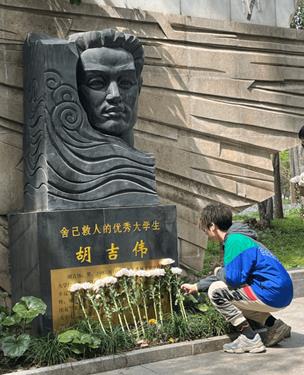公司党建工作中心的黄长虹现场讲述胡吉伟的求学往事与英雄壮举。当听到胡吉伟义无反顾跃入湖中救人的细节时,同学们不由肃然起敬,共同面向胡吉伟雕像默哀一分钟,并依次上前敬献鲜花,追思英烈崇高精神。