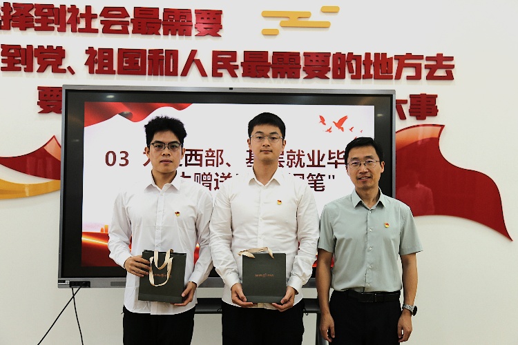 在基层就业赠礼仪式环节。孙禄为赴西部、基层就业的毕业生党员赠送了“初心钢笔”,希望他们不忘初心,牢记使命,未来在基层岗位上发光发热,将“论文”写在祖国大地上。
