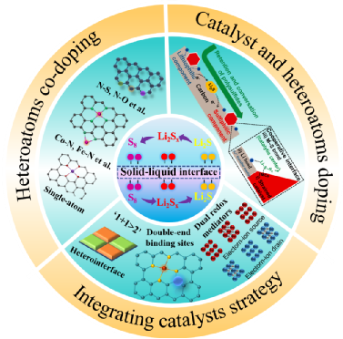 本次在《先进能源材料》发表的综述以上述策略为基础,详述总结了杂原子共掺杂,杂原子掺杂碳与催化剂,不同催化剂的结合所产生的不同协同催化效应在锂硫电池的发展和作用机理,并展望了未来锂硫电池的研究方向,为更高效固液协同界面的开发梳理的思路。