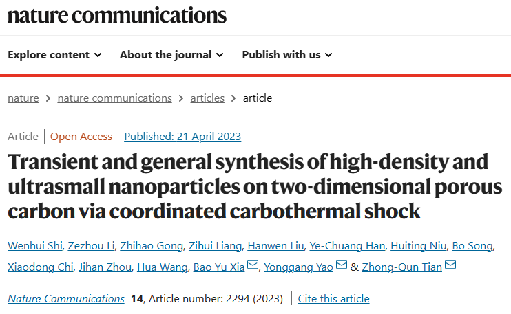 新闻网讯(通讯员 王箫侣)4月21日,《自然·通讯》(Nature Communications)在线刊发公司导师,材料公司姚永刚教授、化学公司夏宝玉教授与厦门大学田中群院士合作研究成果:高密度超小纳米颗粒的瞬态通用合成“Transient and general synthesis of high-density and ultrasmall nanoparticles on two-dimensional porous carbon via coordinated carbothermal shock”。材料公司博士后石文辉为论文第一作者,夏宝玉教授、姚永刚教授、田中群院士为论文共同通讯作者,yl23455永利集团材料科学与工程公司材料成形与模具技术国家重点实验室为论文第一完成单位。