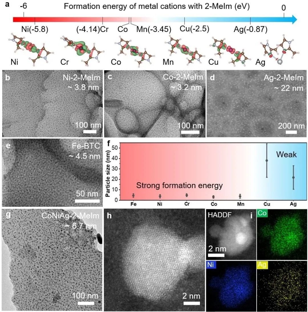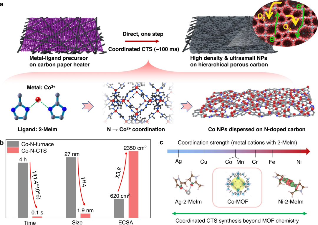 团队研究的高密度和超小纳米颗粒的瞬态通用合成,让纳米颗粒均匀分散并锚定在二维多孔碳上,通过直接配位碳热冲击(Coordinated-CTS, ~100 ms)对金属配体前驱体进行热解,而无需耗时的MOF制备。