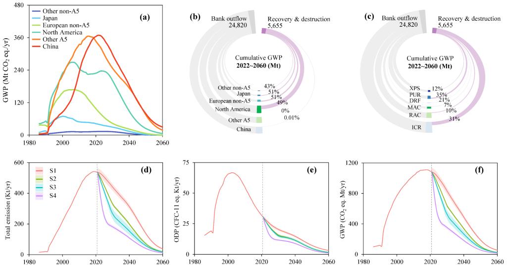 在家用冰箱、各类空调、工商制冷设备以及建筑保温隔热材料中广泛使用的CFCs(Chlorofluorocarbon,氯氟碳化合物,简称氟利昂)、HCFCs(Hydrochlorofluorocarbons,氢氯氟碳化合物)和HFCs(Hydrofluorocarbons,氢氟碳化合物)等制冷剂和发泡剂,是主要的非二氧化碳温室气体(约为CO2的数百倍到数千倍),会随这类耐用品的使用过程及废弃阶段的泄露排放而造成显著的全球气候变化影响(GWP)。尽管第一代制冷剂/发泡剂CFCs类早在2010年已全部停止生产使用,但作为CFCs的替代物质,HCFCs和HFCs仍在大量生产和使用,目前每年生产约为150至200万吨。即便完全根据《蒙特利尔议定书》及其《基加利修正案》的要求进行限制生产和逐步淘汰,HCFCs和HFCs仍会随着这些耐用品的持续使用和报废而造成长期滞后的GWP影响。在全球主要国家和地区践行碳中和目标下,需要深入探索存量HCFCs和HFCs在各类耐用品中的滞后排放路径和特征,同时阐明碳氟化学品的类别及其在全球不同区域、不同产业类别(行业部门)的时空异质性,研判其未来持续排放趋势、减排潜力以及减排路径具有重要意义。