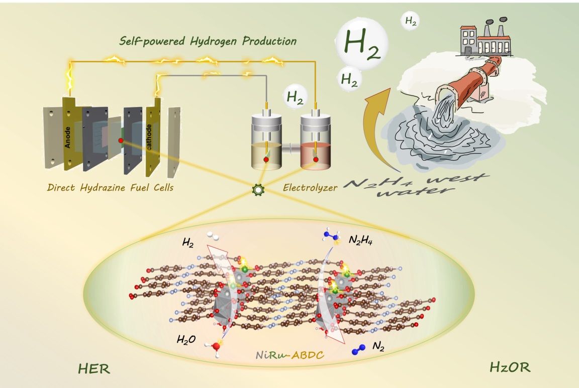 图 1. 富钌金属-有机框架催化剂同时实现低能耗绿氢制取及水合肼废水处理示意图。