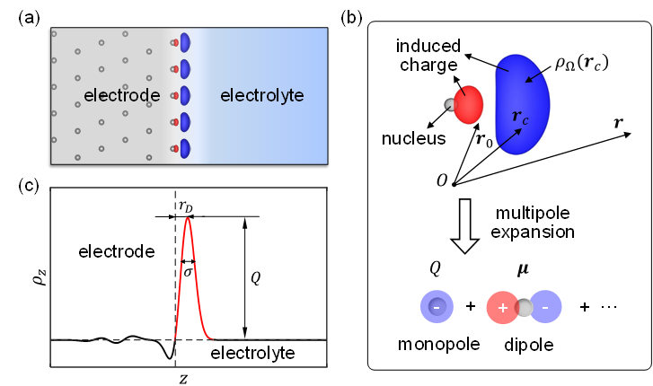 考虑电子溢出效应分子模拟方法的示意图。(a)双电层界面的电极诱导电荷;(b)诱导电荷的多极矩展开;(c)诱导电荷分布的示意图。红色、蓝色等值面分别代表正电和负电。