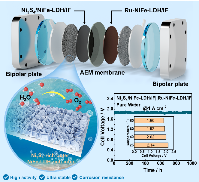 此外,团队进一步将非贵金属腐蚀工程策略拓展至工业级电解水体系中,通过S2−诱导的硫化腐蚀过程,在NiFe-LDH催化剂表面原位形成梯度分布的Ni3S4活性层,构建出具有高电荷转移效率和稳定性的梯度异质结构。该结构在增强界面电子耦合与提升离子扩散能力的同时,有效克服了传统NiFe-LDH在高电流密度下析氧活性衰减的难题。在纯水阴离子交换膜电解槽中,该催化剂可在1A/cm2工业级电流密度条件的纯水中稳定运行1000小时,保持了较好的催化性能和结构完整性,为非贵金属催化材料向真实电解水工业化应用迈进提供了重要支撑。