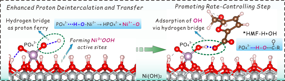 图为Ni(OH)2-PO43−/Ni3(PO4)2催化剂的界面氢桥工程用于HMF电催化氧化。