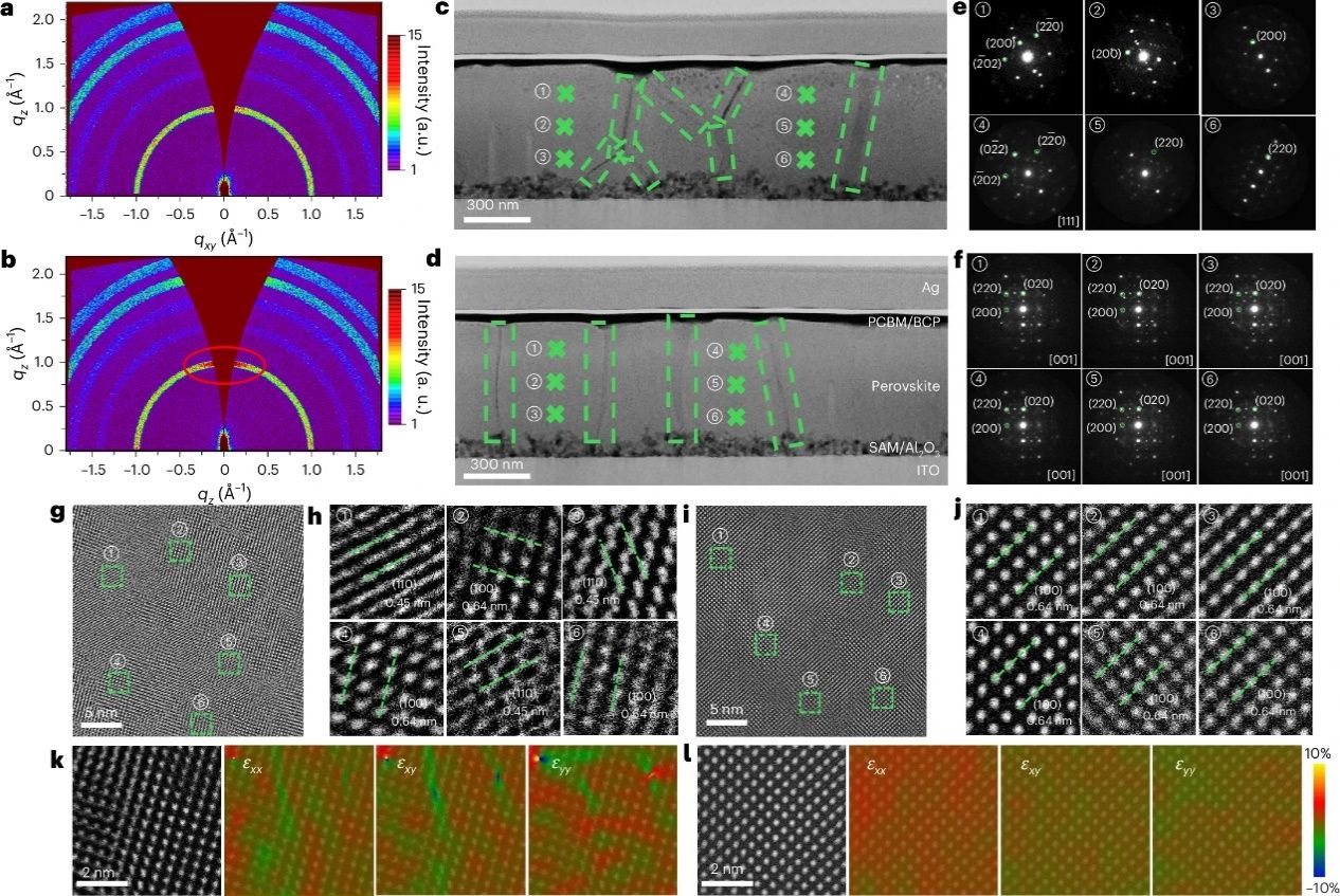 基于该双分子策略制备的反式钙钛矿太阳能电池实现了27.02%的光电转换效率(认证效率达26.88%),是目前已报道的单结器件最高效率之一(图4)。器件同时展现出良好的稳定性,在连续工作2000小时后仍能保持初始效率的98.2%。此外,研究团队制备的孔径面积为11.09 cm2的反式微型组件实现了23.18%的认证稳态效率。将该策略拓展至窄带隙钙钛矿体系后,同样具备诱导面外择优取向性的效果,基于此制备的全钙钛矿叠层太阳能电池则实现了29.07%的认证效率。