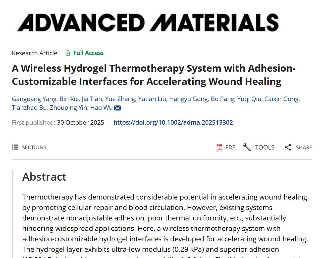10月30日,国际权威期刊“Advanced Materials”刊发公司中方导师、机械公司尹周平教授所在团队在柔性电子医工交叉领域的新成果,题为“A Wireless Hydrogel Thermotherapy System with Adhesion-Customizable Interfaces for Accelerating Wound Healing(界面黏性可定制的无线水凝胶热疗系统用于加速伤口愈合)”。机械公司2022级博士生杨淦光为论文第一作者,工艺装备及自动化系讲师谢斌和同济医公司附属协和医院副主任医师田甲为共同第一作者,吴豪教授为通讯作者,尹周平教授等为共同作者。