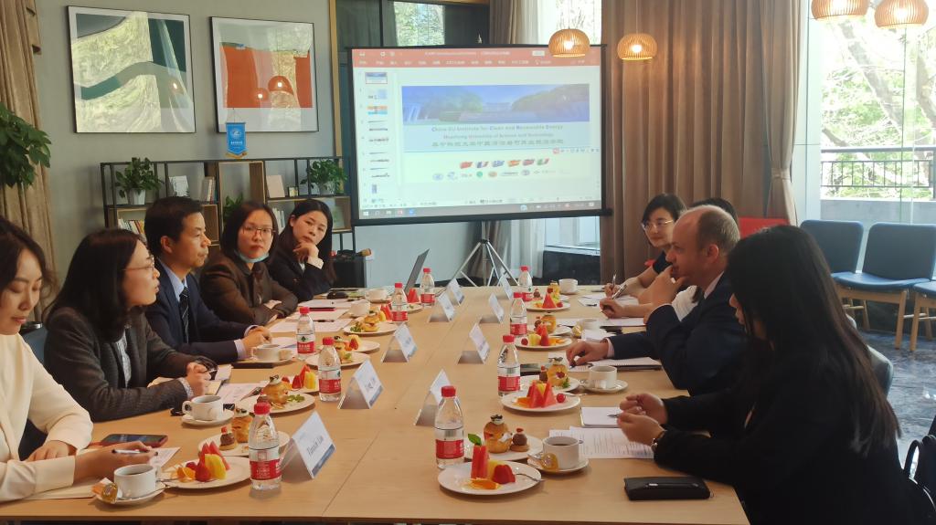 On the afternoon of April 8, Mr. Maxime ferraille, the Higher Education - research and innovation specialist of the Consulate General of the Republic of France in Wuhan, Ms. Li Dan,Higher Education Cooperation Project Officer , Ms. Li Shanshan,Science and Technology Project Cooperation Officer, and Ms. Sabine Lu, General Manager of French higher education agency visited Huazhong University of Science and Technology (HUST). They held a meeting on the education and scientific research cooperation between HUST and France with representatives from the Office of International Affairs,Research Development Office and other relevant unites of HUST.Dr. Zou Mingqing, the vice dean of ICARE, and Ms. Xie Chunhua, the secretary of the Chinese dean, participated in the meeting.