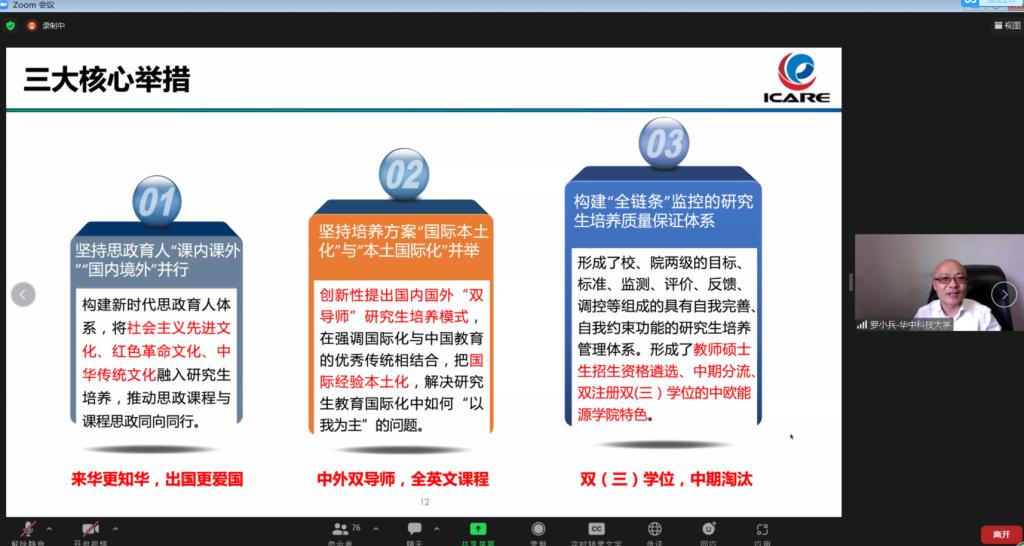 Prof. LUO Xiaobing gave a keynote report entitled "Exploration and Practice of International Talent Training Mode for Postgraduates of new energy discipline in the New Era". He said that the internationalization of graduate education is an inherent need for the higher education in the new era. Under the background of energy security and "double carbon" strategy, ICARE insists on integrating the cultivation of responsibility and morality into the whole training system, promotes the "international localization" and "Local Internationalization" for graduate education, strengthens the "whole chain" process management, and has cultivated a number of talents with national feelings, international vision, and global competitiveness.