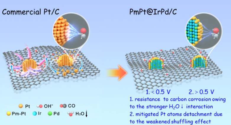 To solve the above-quoted problems, Professor Wang Deli's team first proposed a two-stage recession mechanism from the perspective of commercial Pt/C stability: 1. When the potential was lower than 0.5V vs RHE, Pt atoms catalyzed the oxidation of carbon support to produce CO, and CO* species then flowed back to the surface of Pt, resulting in the toxicity of the catalyst and the decrease of the electrochemically active area. 2. When the potential is higher than 0.5V vs RHE, the OH* species in the solution promotes the separation of Pt atoms on the surface of Pt nanocrystals, and the active sites are sharply reduced. The results provide a theoretical basis and design ideas for the development of catalysts with high activity and high stability in alkaline membrane fuel cells.