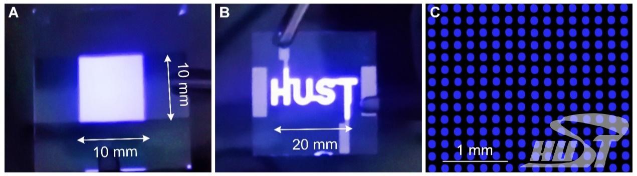 Professor Tang Jiang and his team from the Wuhan National Laboratory for Optoelectronics and School of Optical and Electronic Information have developed a series of rare earth cerium halide luminescent materials, which achieve continuous and highly efficient and stable luminescence from violet light to deep blue light. They have realized for the first time deep blue photoluminescent diode chips, large-area and pixelated light-emitting devices and films based on them. It shows great potential for high-quality display applications.