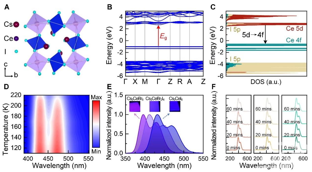 Professor Tang Jiang and his team developed cerium halide Cs3CeBrxI6-x (x=0~6), which can be continuously tunable from blue light to violet light, by taking advantage of the high PLQY, bright color, stable spectrum, low price, non-toxic and environmentally friendly, abundant reserves and other significant advantages of lanthanide rare earth cerium. For the first time, the team systematically explored the material's crystal structure, band structure, luminescence mechanism, and its application in rare earth light-emitting diode (RELED) chips. In particular, Cs3CeI6 has bright deep blue emission with color coordinates of (0.15, 0.04), which is in line with the most stringent Rec.2020 Blu-ray chip standard.