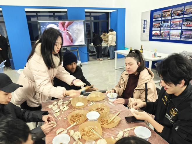 Following the presentations, students gathered to make dumplings. The hall was filled with laughter, and the atmosphere was warm as the students shared their experiences in making dumplings. Some students even added pistachios to the dumplings' stuffing, hoping to bring good luck to those who ate them. The event ended in a lively and peaceful scene.