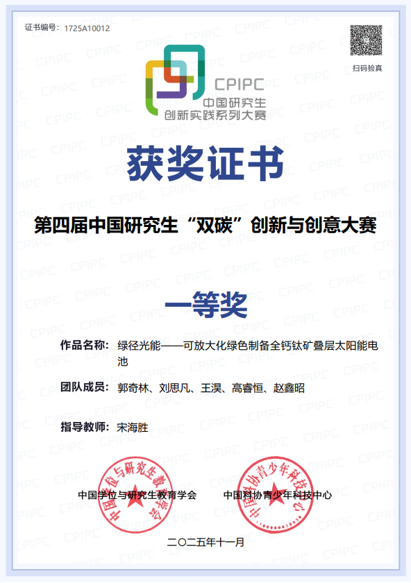 Under the guidance of Professor Song Haisheng, an ICARE Chinese supervisor and member of the Wuhan National Laboratory for Optoelectronics, ICARE student Guo Qilin completed the project titled “Green Path Photovoltaics: Scalable and Green Fabrication of All-Perovskite Tandem Solar Cells,” which won a first prize in the competition.